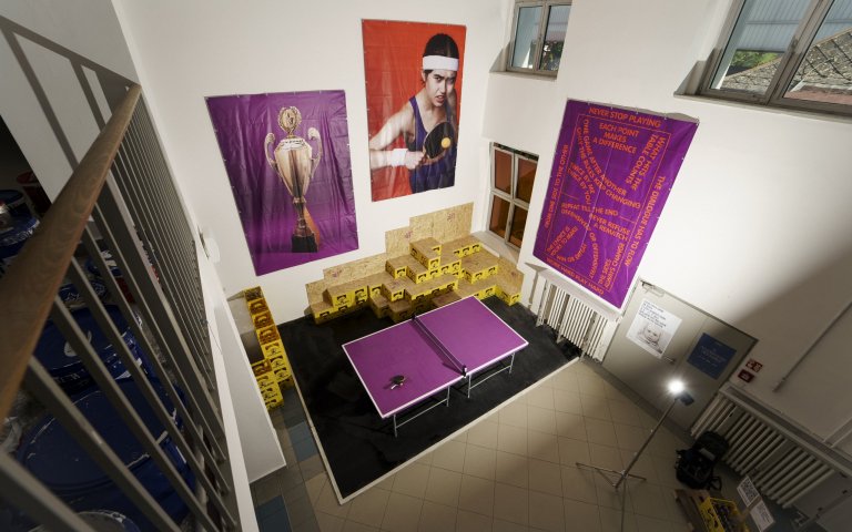 Název prozrazuje, že dnešní díl přináší zcela sportovní téma, které vás nemá jen unavit, ale spojit a stmelit s prostředím i lidmi, které často jen míjíte na chodbách školy. Naše atrium již od letního semestru získalo nové využití díky uměleckému seskupení studentů – Ping Pong Ping, které nám všem, kdo zde tvoříme či pracujeme, vneslo do cesty fialový pingpongový stůl a vstřícné posezení. Není tedy žádné překvapení, že jsme se rozhodli tento kolektiv pozvat k mikrofonu a přiblížili vám jejich projekt, který si klade za cíl prolomit ledy mezi lidmi. Za mikrofon usedla Hana Kubrichtová, Anna Vašičková a David Stejskal, kteří si tento všeobecně známý bezkontaktní míčový sport hraný s pálkou přivlastnili a vytvořili s jeho pomocí modulární architekturu vestibulu školy. PPP skrze stolní tenis tematizují principy fungování nejen v uměleckém prostředí – soutěživost, píli, regeneraci, výhru a důležitost míti cíl, ale jak sami říkají: „Vyzdvihujeme potřebu společného dialogu dvou stran a hravosti v životě, ať už profesním či osobním.“ Přijďte si zahrát pinec.