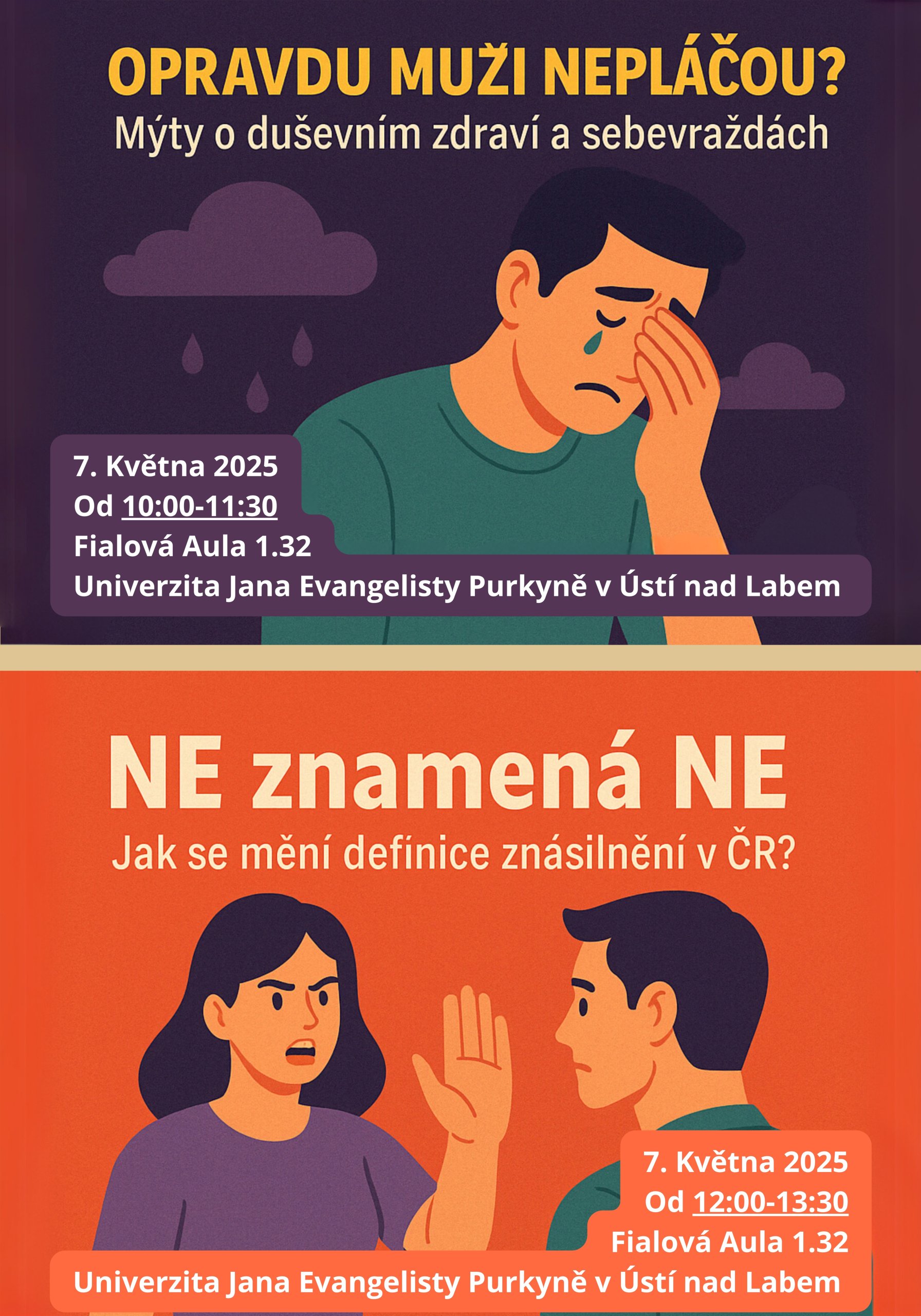Přijměte pozvání na akci, které se zúčastní zástupci institucí jako je Nevypusť duši, Liga otevřených mužů, Konsent a Hrdá legal. Součástí Dne pro sociální bezpečí, který se uskuteční 7. 5. 2025 na UJEP budou přednášky se zajímavými hosty na téma duševní zdraví, tabuizace emocí nebo např. aktuální změny v zákoně spojené s těmito tématy.